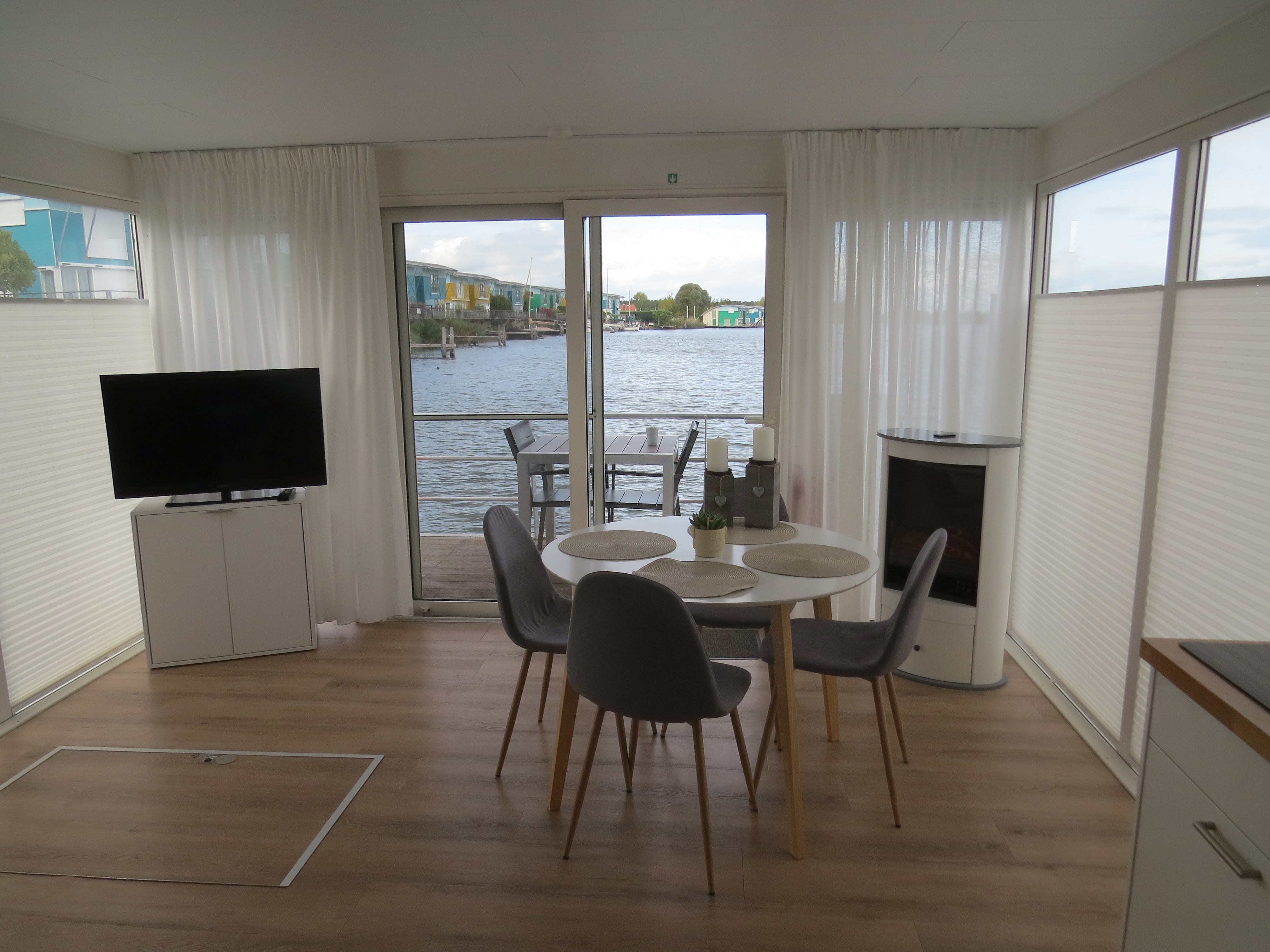 The houseboat is equipped with a state-of-the-art kitchen (stove, microwave, air fryer, kettle, coffee machine, fridge and freezer, dishwasher, dishes, etc.) – everything you need if you like to cater for yourself.